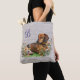 Mit Monogramm Hunde der Dackel toten Tasche. Beide Seiten haben Bilder von Dackeln. Der eine ist schwarz, der andere braun. Sie stehen und sitzen zwischen Wildblumen und Sonnenblumen. Eine Seite hat eine erste Vorlage, die gelöscht werden kann, wenn Sie den Beutel leer bevorzugen. Imitate Holzkorn ist die Umhüllung um das Hintergrundbild. Die Taschen sind ausgekleidet, haben einen schwarzen Griff und sind in zwei Größen erhältlich.