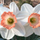 Das Foto auf dieser Karte zeigt zwei Daffodils mit einem rosa Becher in der Mitte.