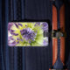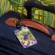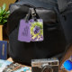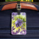 Dies ist ein Bild einer lila und gelben Dahlia-Blume auf einem Gepäckanhänger mit einem Lederband. Die andere Seite kann mit Ihren Informationen angepasst werden.