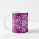 Dieses weiße Mandala sitzt auf einem lila, warmen Hintergrund. Die Farbe ist luxuriös und kreativ. Teil der Sammlung Pras Mandala.