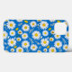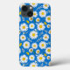 Lebhaftes und fröhliches Muster von Désies vor einem hellblauen Hintergrund. Die Gänse sind überwiegend weiß, mit fett gelben Mittelpunkten, und sie sind verstreut, aber ausgewogen angeordnet. Neben den Blume gibt es verschiedene grüne Blätter und zarte Stiele, die durch das Design verstreut sind und eine Touch von Natur und Frische verleihen. Die Gesamtkomposition schafft ein lebendiges, sommerliches Ambiente, das es optisch ansprechend und einladend macht.