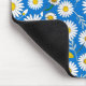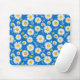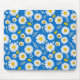 Lebhaftes und fröhliches Muster von Désies vor einem hellblauen Hintergrund. Die Gänse sind überwiegend weiß, mit fett gelben Mittelpunkten, und sie sind verstreut, aber ausgewogen angeordnet. Neben den Blume gibt es verschiedene grüne Blätter und zarte Stiele, die durch das Design verstreut sind und eine Touch von Natur und Frische verleihen. Die Gesamtkomposition schafft ein lebendiges, sommerliches Ambiente, das es optisch ansprechend und einladend macht.