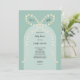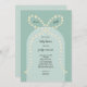 My daisy bow baby shower invitation features an arch background in two shades of teal with a large bow adorned with hand drawn daisies.