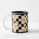 Daisy Coffee Mug avec un arrière - plan en damier dans les couleurs jaune, blanc et noir.