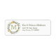 Dieses Adressetikett hat einen wunderschönen Blumenkranz, der aus gelben und weißen Gängen und grünen Blätter besteht. Ihr Monogramm ist in der Mitte in passendem Gold. Ihr Name und Ihre Adresse befinden sich rechts neben dem Bild.