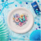 Paper plates with a beautiful illustration. A heart-shaped bouquet of flowers in pastel blue, green, purple and yellow. With a lovely blue butterfly hovering in front.