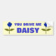 Dieser brillante Autoaufkleber ist mit zwei Digitalbildern einer Daisy mit einem grünen Stiel mit zwei grünen Blätter und hellblauen Blütenblättern mit einem hellblauen Zentrum ausgestattet. Der Hintergrund ist sonnengelb und der hellblaue Text liest sich, du tust mich daisy.