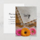 Passen Sie die informelle und elegante Daisy Trio und Lace Country Barn Wedding RSVP Card mit Ihrem speziellen Party Ehe Zeremonie Antwort Datum. Diese hübschen, rustikalen Ranch- und VIP-Antwortkarten sind mit einem malerischen Blumenfoto von zwei rosa Gänseblüten und einer orangen Blüte aus der Blume, einem Vintagen, cremefarbenen Leinenhandtaschentuch und einem weißen Brautschleier mit einem verwitterten braunen Holzhintergrund versehen.