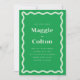 Diese Einladungen für Hochzeiten sind in einer fett grünen Farbe mit einer leichten Minze gehalten, die eine lebendige und spielerische Ästhetik schafft. Die Retro-Wave-Grenze fügt eine Touch Nostalgie hinzu und fügt dem Design ein lustiges und einzigartiges Element hinzu. Die Einladungen sind in verschiedenen Farbvarianten erhältlich und bieten Ihnen die Flexibilität, einen zusammenhängenden Look für Ihren besonderen Tag zu schaffen. Die koordinierende Schreibwarenhandlung ist so konzipiert, dass Sie Ihre Hochzeit individuell und koordiniert gestalten können.