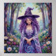 This fantasy poster features a serene purple-haired witch in an enchanted forest, wearing a wide-brimmed hat and flowing gown among daisies - dreamy, mystical fantasy art illustration. Finished in a oil acrylic impasto painterly style.