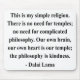 " Dieses ist meine einfache Religion. Es gibt keinen Bedarf an den Tempeln; kein Bedarf an schwieriger Philosophie. Unser eigenes Gehirn, unser eigenes Herz ist unser Tempel; die Philosophie ist Güte." - Dalai Lama