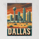 Ein Vintages Reiseplakat zeigt die Skyline von Dallas mit dem ikonischen Wiedersehen Tower und anderen modernen Wolkenkratzern gegen einen orangen und roten Sonnenuntergang über einer Wüstenlandschaft mit geringer Vegetation. "DALLAS" wird im unteren Teil eines dekorativen Randes kühn angezeigt.