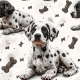Seamless pattern featuring Dalmatian puppy and dog bones, digital art, high detail, soft shadows, white background.