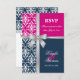 © 2013 Sozialite Designs. Elegante Hochzeitskarte RSVP für eine Sommerhochzeit mit weißem Damast, bedrucktem Silberband und Bogen, zwei Hintergrundfarben marineblau und fuchsia. Bitte kontaktieren Sie Socialite Designs, wenn Sie eine andere Farbkombination, Hilfe bei der Anpassung oder andere Hochzeitsprodukte, die mit diesem Design erstellt wurden, wünschen. BITTE BEACHTEN SIE, DASS DAS RIBBON EIN BILD IST UND AUF DIE EINLADUNG DRUCKT WIRD.