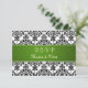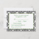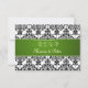 Einladungs-Repylkarte mit schwarz-weißem Damast-Muster und breitem grünem Streifen.