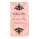Ein hübsches Etikett, um Ihre besondere Flasche Hochzeitswein anzubringen. Im Hintergrund ist ein rosa Damast-Muster erkennbar. Schwarze Dekorationen oben und unten geben ihm Flair. Ihre persönlichen Hochzeitsinformationen gehen in der Mitte.