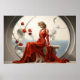 Peinture semi-surréaliste d'une femme aux cheveux blonds vêtue d'une robe de soie rouge coulante et de chaussures blanches assis sur un banc devant une fenêtre ronde dans une pièce blanche pure avec des fleurs rouges accusant sa robe. Réalisé à l'aide d'algorithmes génératifs et Photoshop.