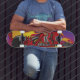 Dieser lustige Dämon-Schädel mit Flammen umarmt seine Gitarre, weil er vom Geist von Rock n' Roll besessen ist.