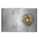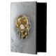 Konzeptioneller, mechanischer, menschlicher Kopf mit antiken Manometer und Metallgetriebe vor grauem industriellem Hintergrund. Steampunkstil.