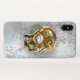 Konzeptioneller, mechanischer, menschlicher Kopf mit antiken Manometer und Metallgetrieben vor grauem industriellem Hintergrund. Steampunkstil.