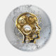 Konzeptioneller, mechanischer, menschlicher Kopf mit antiken Manometer und Metallgetrieben vor grauem industriellem Hintergrund. Steampunkstil.