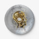 Konzeptioneller, mechanischer, menschlicher Kopf mit antiken Manometer und Metallgetrieben vor grauem industriellem Hintergrund. Steampunkstil.
