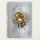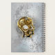 Konzeptioneller, mechanischer, menschlicher Kopf mit antiken Manometer und Metallgetrieben vor grauem industriellem Hintergrund. Steampunkstil.
