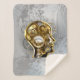 Konzeptioneller, mechanischer, menschlicher Kopf mit antiken Manometer und Metallgetrieben vor grauem industriellem Hintergrund. Steampunkstil.
