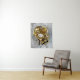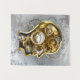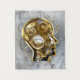 Konzeptioneller, mechanischer, menschlicher Kopf mit antiken Manometer und Metallgetrieben vor grauem industriellem Hintergrund. Steampunkstil.