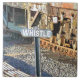 Ein Kunstentwurf der Abfahrten in einem alten Dampfbahnhof, der die Eisenbahnlinien und Güterzugwagen-Räder mit einem Schild mit "Pfeifen" zeigt.