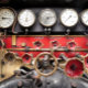 Die Dampfzug-Fahrer schauen von der Fußplatte der Spurweiten und Kontrollen des Zuges aus.