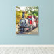 Eine schön restaurierte rote Dampfbahn und Wagen.