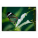 Ein Glasschmetterling sitzt leise auf einem Blatt.