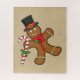 Eine Illustration eines glücklichen, tanzenden Lebkuchenmannes mit einem Oberhut und einem Bonbonstock. Während der Weihnachtsfeiern sind Lebkuchen und Bonbons immer präsent. Ein Lebkuchen zu backen ist ein Weg, um mit der Familie zu verbinden und Kinder glücklich zu machen.