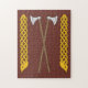 In dieser originalen Illustration von Richard H. Fay werden zwei lange verhaftete Wikinger-Ära (frühmittelalterlich) dänische Äxte zwischen zwei Plattenketten dargestellt, die auf einem Design aus einer Viking Age Steinskulptur auf der Isle of Man basieren.