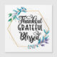 Dankbar, dankbar und gesegnet, bietet dieses Christliche Design einen wunderschönen blauen Blumenkranz mit Sprichwort "Dankbar, Dankbar und gesegnet".
