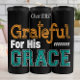 Dies ist ein grafisches Design-Stück mit dem spirituellen Satz "GRATEFUL FOR SIS GRACE" in einem mehrfarbigen, geschichteten Schriftart. Der Text ist Set auf einem einfachen, hellgrauen Hintergrund. Das Wort "Dankbar" wird in einem großen, texturierten orangefarbenen Schriftart mit einem in das Design integrierten Kreuz dargestellt. Die Wörter "Für Ihn" und "GRACE" sind kontrastweiße und bedrängte aquamarine Schriftart, getrennt durch dekorative Linien. Die Ästhetik ist modern und religiös, geeignet für eine Vielzahl von inspirierenden Produkten.