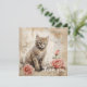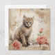 Ein flauschiges Tabbykätzchen mit auffallend blauen Augen sitzt neben zwei rosa Rosen vor einer Kulisse mit Vintagen Schrift- und Tintenklecksen. Die Sepia-Töne verleihen der Komposition, die Blumen und ein süße Tier verbindet, ein warmes antikes Ambiente.