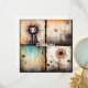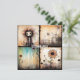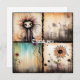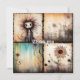 Ein skurriler Charakter mit wilden Haaren und großen Augen besticht durch das links Quadrat, der auf eine ästhetische Ästhetik im Stil von Tim Burton hinweist. Der obere rechte Platz besticht durch eine gotische Architektur mit einer trostlosen, möglicherweise postapokalyptischen Atmosphäre, während die unteren Quadrate stilisierte, lebendige Blume vor einem ätherischen Hintergrund darstellen.