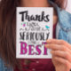 Dank dieses einzigartigen handgeschriebenen Stil Typografie-Designs mit der Botschaft: "Danke, dass ihr die Besten seid." Das Design umfasst Vogel- und Blume-Akzent auf weißem Hintergrund. Inside Message kann an Ihre persönlichen Bedürfnisse angepasst werden, hat aber diese Botschaft: Mein Herz ist überfüllt mit Dankbarkeit an Sie. Dankeschön!