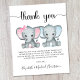 Günstige niedliche Twin-baby Girl and baby Boy Dusche Dankeschön-Karte mit "danke" in einem stilvollen Drehbuch mit Wimpern und Aquarellen von pinkfarbenem Baby Elefant und einem blauen Baby Boy Elefant. Unterhalb können Sie einfach Ihre Danksagung personalisieren oder für eine handgeschriebene Notiz leer verlassen werden.