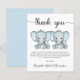 Carte de remerciements de douche pour bébé jumeaux à prix abordable avec "merci" dans un script élégant avec des swashes et deux aquarelles de bleu bébé éléphants. Sous personnalisez votre message de remerciement ou laissez vide pour une note manuscrite.