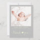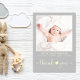 Eine einfache und süße, geschlechtsneutrale Geburtshinweise mit moderner pastellgelber Typografie vor weich grauem Hintergrund. Die Vorderseite zeigt das Foto Ihres Neugeborenen, den vollständigen Namen, das Ankunftsdatum und die Geburtsdaten, und "Danke" in einem trendigen pastellgelben Skript, in dem ein Herz die beiden Wörter verbindet. Auf der Rückseite der Karte können Sie ein zusätzliches Foto, eine Danksagung und Eltern- und Geschwisternamen unter einem niedlichen pastellgelben Pfeil mit einem Herzstück in der Mitte hinzufügen.