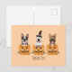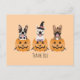 Illustration von drei französischen Bulldog Welpen in verschiedenen Farben in Kürbissen, die in Halloween-Kleidung gekleidet sind.