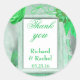 Custom Wedding Dankeschön Labels bietet eine grüne Landschaft, die nach Ihrem Geschmack personalisiert sein kann. Diese Aufkleber präsentieren ein grünes Blumenmotiv mit Holzkombination, "Danke" ist in kursiv grünem Schriftart geschrieben, gefolgt von dem Namen des Paares und dem Hochzeitstag. Sticker Design: Weddingsby Rhoadie Artwork: Oberholster Venita