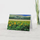 Feld der Sonnenblumen mit grünem Laub. Blauer Himmel und Hügel im Hintergrund. Karte kann zum Anzug personalisiert sein Ihr spezifischer Bedarf.