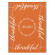 Dress deinen Erntedank-Tisch mit diesem "dankbaren" Design mit einem modernen Drehbuch. Wiederholter "dankbarer" Text und eine Fallkranz-Illustration in der Mitte. Freuen Sie sich auf einen Thementisch. Die moderne, gebrannte Orange Farbe kann mit dem Werkzeug für die weitere Bearbeitung auf die gewünschte Farbe geändert werden.