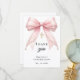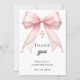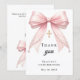 Eine moderne und elegante Konfirmations-Dankkarte. Ein weißer Hintergrund, verziert mit einer großen rosa Schleife mit Perlen und einem goldenen Kreuz. Auf der Vorderseite der Text: Dankeschön, Name und ein Datum. Rückseite: Vorlage für Ihre Dankesnotiz und Name.