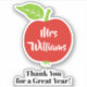 Red Apfel Lehrer Wertschätzung Danke Sticker . Dieses schöne Typografie-Design zeigt einen roten Apfel mit einem grünen Blatt und Ihren "Danke"-Text zusammen mit dem Namen des Lehrers. Zeigen Sie Ihrem Lieblingslehrer mit diesem kissenscharfen Aufkleber Ihre Wertschätzung.