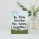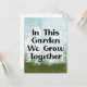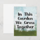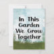 Un joli tableau typographique sur le thème du jardin avec les mots "Dans ce jardin nous grandissons ensemble". Il est vert et bleu avec du texte noir et un accent blanc sous la citation.